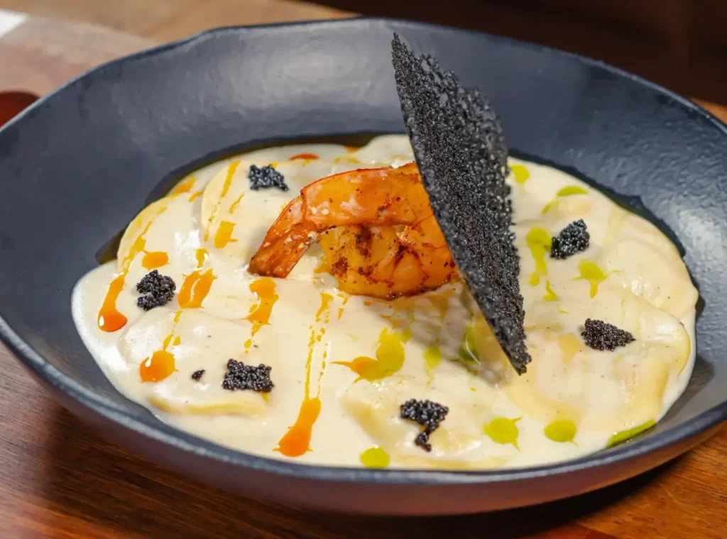 “Ravioli artesanal recheado com camarões frescos, envolvido em nosso cremoso molho branco de Grana Padano e um toque vibrante de limão siciliano. Finalizado com camarão grelhado e ovas black de tobiko que explodem em sabor a cada garfada.”