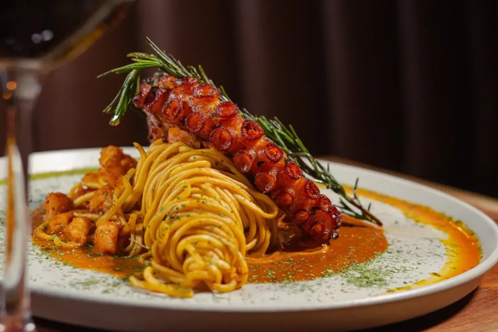 “Uma sinfonia dos mares em cada fio de massa. Nosso spaghetti banha-se no intenso molho bisque, abraçado por camarões suculentos e tentáculos de polvo macios, com o aroma envolvente do alecrim fresco. Uma experiência que marca memórias.”